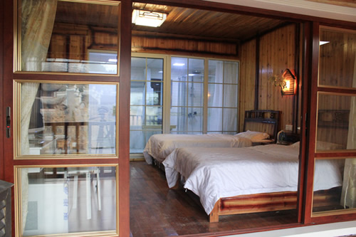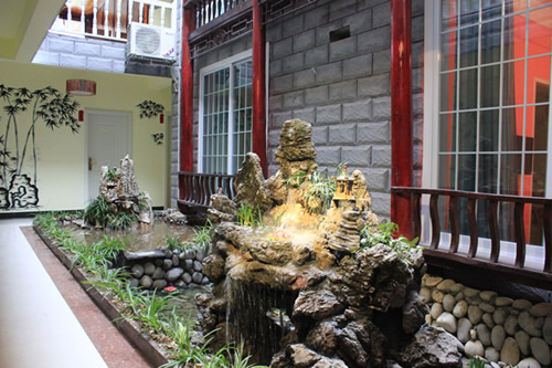 古樸的客房內(nèi),超大陽臺(tái)全景落地窗,是您欣賞沱江風(fēng)光帶首選客棧,兩座百年四合院內(nèi)小橋流水,假山錦鯉,一百三十平米休閑花園別具情調(diào)。紅酒加咖啡的大堂吧、彩色精致的情調(diào)房、古典高雅的臨江觀景房以及大型公共觀景平臺(tái),龍閣的點(diǎn)點(diǎn)滴滴都透著出古城的神韻和幽靜,走進(jìn)龍閣客棧,給您一個(gè)完美的鳳凰古城沱江全景!