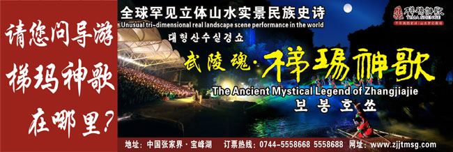 The Ancient Mystical Legend of Zhangjiajie 《武陵魂•梯瑪神歌》是一場記述土家族起源、演變、戰(zhàn)爭、生產(chǎn)生活等內(nèi)容的大型立體山水實(shí)景演出,揉合了音樂、舞蹈、文學(xué)等多種藝術(shù)形式,如幻如夢的舞美燈光,搖曳生姿的原生態(tài)歌舞……濃縮了土家族數(shù)千年的發(fā)展歷史,400多名演員以自然淳樸的表演充分的展示了土家的民族文化特征,給游客帶來了耳目一新的感受。一場視聽的饕餮盛宴,一曲驚天地、泣鬼神的曠世古歌,給人山水文化光影視聽的享受。【出品:張家界梯瑪神歌文化傳播有限公司】