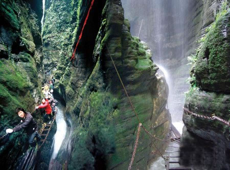 坐龍峽風(fēng)景區(qū)位于古丈縣河西鎮(zhèn),與“芙蓉鎮(zhèn)”--王村一水之隔。經(jīng)由300萬(wàn)年大自然的風(fēng)吹、水蝕而成,一直隱逸于湘西茫茫十萬(wàn)群山之中。它長(zhǎng)約3500米,最大高差達(dá)300余米;寬處不足丈余,窄處僅容一人通過(guò);谷內(nèi)絕壁縱疊,溪瀑橫懸,崖樹斜逸,異草遍坡。