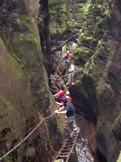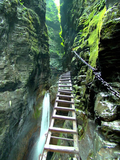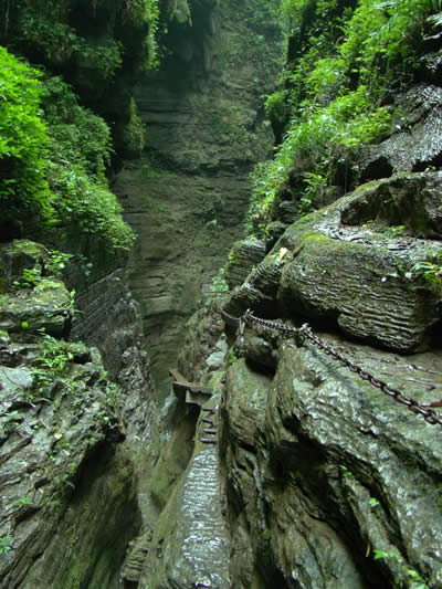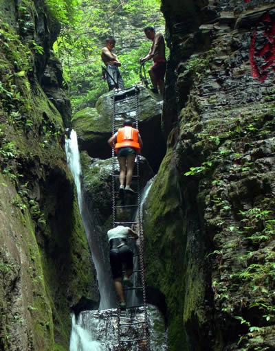 坐龍峽擁有中國(guó)第一條特種游道。所有游道均建于峽谷深處,依山取勢(shì),既經(jīng)細(xì)心雕琢聽(tīng)卻又渾然天成。粗樸的板栗木棧道,可以讓你零距離的親近那一潭碧幽、聽(tīng)聞山泉叮咚;精巧的跳墩,可以讓你媳戲流泉、觸感溪瀑;原質(zhì)的石坎道,讓你不得不調(diào)動(dòng)全部的身心能量悉心攀援、感悟峽谷;有驚無(wú)險(xiǎn)的鐵梯,讓你伴著腳下轟鳴的溪水,在驚怵中體味一份快慰。出口處的土家山寨,保留了古樸獨(dú)特的生活習(xí)俗。一塊臘肉就一口醇香的“苞谷燒”會(huì)讓你洗去所有的疲憊,在輕松中憨厚的主人向你講述過(guò)去強(qiáng)人出沒(méi)的故事......