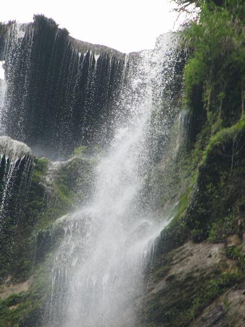 杉刀溝盡頭,有一抹泉水從200多米高的崖頂飄然而下,仿佛一匹白色長練自天而降。飛瀑下臨深潭,綠水泱泱,水霧漫漫,睛雨交加之日,時(shí)有彩虹飛升。每當(dāng)山洪瀑發(fā),瀑布猶如一巨龍,飛騰傾瀉,聲若巨雷,蔚為壯觀。