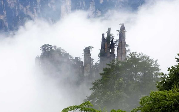 御筆峰是并列的三座石峰,高低不一,峰頂長(zhǎng)有松樹,極象幾枝倒插的毛筆。傳說(shuō)這是向王天子的“御用筆”,故名御筆峰。這里云纏霧繞,似沉似浮,人稱“瓊山仙閣”。 |