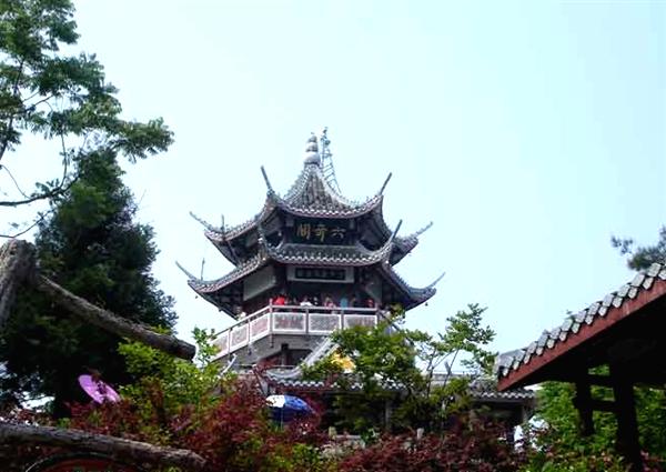 六奇閣位于張家界森林公園黃石寨項(xiàng)的人工建筑。因張家界國(guó)家森林公園”山奇、水奇、云奇、石奇.樹奇以及珍禽異獸之奇”而得名。閣分3層,黃瓦蓋頂,飛檐翹角,畫梁彩棟,回廊石欄。登閣憑眺,滿目佳景。閣柱楹聯(lián)日:“翠鬟煙籠,綠樹云封.昔日曾遮半個(gè)面:麗質(zhì)天生,畫圖省識(shí),今朝始醉四方人!庇忠宦(lián)云“名動(dòng)全球,到此實(shí)堪三擊掌:勢(shì)拔五岳,歸來(lái)不用再看山!遍w內(nèi)設(shè)有土家風(fēng)情歌舞樓.竟日絲竹弦管,清音繞梁。閣基嵌有《張家界國(guó)家森林公園記》全文碑刻。1995年9月8日.全國(guó)政協(xié)主席李瑞環(huán)登閣賞景。