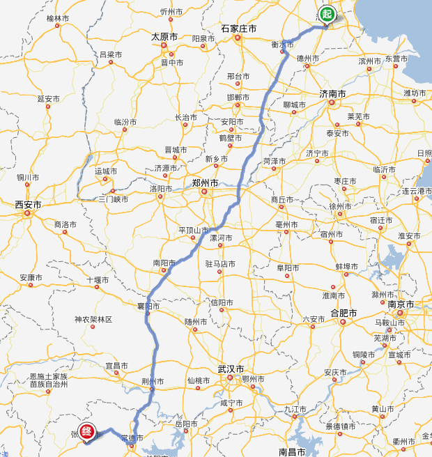 左右,沿途經過滄州——衡水——濮陽——許昌——平頂山——南陽——襄陽——荊門——荊州——石門縣——慈利——張家界。