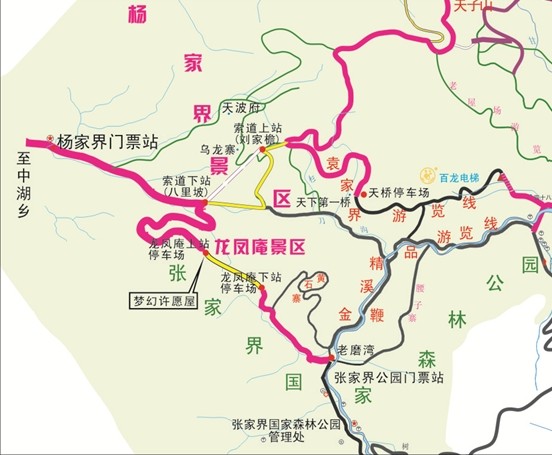楊家界風(fēng)光 三、楊家界索道通往各景區(qū)時(shí)間表: 1、森林公園進(jìn) 從老磨灣停車場(chǎng)到楊家界索道下站時(shí)間為一個(gè)小時(shí)。(包含龍鳳庵景區(qū)參觀游覽時(shí)間) 森林公園門票站——老磨灣停車場(chǎng):(步行)10分鐘 老磨灣停車場(chǎng)——龍鳳庵下站停車場(chǎng):(乘車)5分鐘 龍鳳庵下站——上站生態(tài)木質(zhì)棧道:(步行)20分鐘 龍鳳庵景區(qū)位于上站停車場(chǎng),游覽時(shí)間:20分鐘 龍鳳庵上站停車場(chǎng)——索道下站八里坡停車場(chǎng):(乘車)15分鐘 楊家界索道運(yùn)行時(shí)間5分鐘 索道上站——?jiǎng)⒓议芡\噲?chǎng):(步行)5分鐘 劉家檐停車場(chǎng)——袁家界天橋停車場(chǎng)(乘車)10分鐘 劉家檐停車場(chǎng)——天子山停車場(chǎng)(乘車)25分鐘