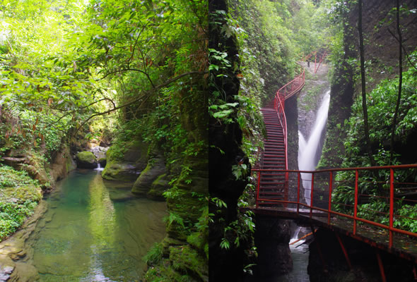 十八潭總名。稍作休憩,我們開始奔赴東線的景點(diǎn)。東線主要是以十八潭為主,下游有4潭:合潭、梳妝潭、魚潭、黑潭;中游有9潭:換衣潭、美人潭、石蛙潭、姊妹潭(3個(gè))、情侶潭(2個(gè))、二龍搶珠,上游有5潭:鬼谷神功(2個(gè))、幽潭、落銀潭(彩虹潭)、路邊潭。十八個(gè)潭深淺不一,淺則1米以上,深則4米左右,形狀各異,有的月牙形,有的豬腰狀,形狀不規(guī)則,石壁上水沖成潭,真是鬼谷神功,此處水質(zhì)細(xì)膩,加之綠林映襯,水色碧綠見底,猶如十八顆翡翠石鑲嵌在山林之間,涓涓溪流晶瑩剔透,飛流直下的瀑布,氣勢(shì)磅礴,蔚為壯觀, 下游的4潭,合潭、梳妝潭、魚潭、黑潭。合潭是仙女峽谷與十八潭的交匯處;梳妝潭的水清如明鏡,又因?yàn)樘秲蓚?cè)石頭的封閉,使這面鏡子靜止不動(dòng),很方便梳妝,照鏡子。在梳妝潭周圍,有一種植物屬于紅豆杉系列,它的形狀好似梳子,可以用來梳頭。魚潭可不能望文生義。魚潭,是在冬天的時(shí)候,所有的魚都聚集在這里過冬,除此之外,這個(gè)潭水淺見底,冬天魚苗聚集,是捕魚的好季節(jié)。黑潭,水深不見底,所以叫黑潭,F(xiàn)在已經(jīng)看不見梳妝潭、魚潭、黑潭了,你猜為什么?建水庫,建水上樂園,淹沒了。 斷魂石的傳說。三國(guó)時(shí)期,高氏和蕭氏一對(duì)夫妻春節(jié)忙活,遇上了天門垮眼,受余震襲擊,打死了丈夫蕭氏。高氏思念丈夫,淚哭不斷,結(jié)果摔死潭中。人們經(jīng)常還能聽到哭聲傳來,不敢單獨(dú)行走,需成群結(jié)隊(duì)。后人為了鎮(zhèn)邪,雕刻一條蜈蚣驅(qū)趕哭魂,多年后,蜈蚣成精,天上打雷,巖石發(fā)光,遭雷所劈,成了斷魂石。 和尚姥,也就是丹灶峰,天門十六峰之一。相傳此峰為仙人化身,赤松子曾在此煉丹,許多詩人在此留下了美妙的詩篇,明代葉守禮《丹灶峰》: 懸崖峭壁隔塵寰,上有仙人學(xué)煉丹。 煉得丹成鶴已去,獨(dú)留丹灶在峰巒。 意思是說,在這險(xiǎn)峻秀麗的山峰上,赤松子潛心煉丹,不受塵世干擾,身心沉醉于秀美的山間,沉溺于丹藥的煉制之中。作者很是羨慕那種與世隔絕的超脫,那種執(zhí)著于自我理想的瀟灑,你羨慕不羨慕? 竹林叢生。我們要學(xué)習(xí)竹子的精神,中空、謙卑;我們要學(xué)習(xí)竹子的精神,抱團(tuán)生長(zhǎng);我們要學(xué)習(xí)竹子的精神,破土而出,節(jié)節(jié)高。 向家塔。打造農(nóng)耕養(yǎng)生游的地方。種田、種菜、種花,農(nóng)家餐館。 爛泥巴根。爛泥巴根和馬桑樹是同科,是這里獨(dú)特的一種樹。馬桑樹亦稱“千年紅”、“馬鞍子”,屬落葉灌木,馬桑樹多枝叢生,一簇一簇的,枝葉像傘蓋,因此“馬桑樹兒搭燈臺(tái)”。春風(fēng)一吹,滿山的馬桑樹、爛泥巴根就吐翠滴綠,顯示出強(qiáng)勁的生命力。打油詩一首: 青青枝條四方走, 肥肥大葉落上頭, 身在路邊無人問, 冬去春來樂悠悠。 秋天死亡,春天長(zhǎng)勢(shì)更加茂盛,它的新生是通過死亡實(shí)現(xiàn)的。山川如此,植物也是如此,這里的一草一木無不透露著道家那種齊生死、等貴賤的精神。 這叫“常道”亭,“道可道,非常道”,據(jù)說是白狐與劉海相遇的地方。吊橋。 十八潭各具特色。 中游有9潭。第五潭叫換衣潭。巖石聳立,霧氣氤氳,巖壁上布滿水汽,猶如雨下。又因過道狹窄,行人需彎腰通過,未免雨水打濕衣裳,在此就要脫下身上衣物,通過后在第六潭再穿上。因此第六潭又叫美人潭,很幽深神秘的。第七潭叫石蛙潭,水淺,又比較平穩(wěn)、安全,春天產(chǎn)籽。余音回響,猶如蛙鳴,給人“聽取蛙聲一片”的錯(cuò)覺。 對(duì)面巖壁叫“臘肉鋪”,那條自上而下的溪流叫“酒長(zhǎng)流”,客人來了,咱土家人熱情,臘肉下炕,苞谷燒,喝兩口! 第八潭第九潭叫情侶潭,比較隱蔽,他倆靜悄悄地談著情話,我們快走,不要打攪他們。 第十潭、十一潭、十二潭叫姊妹潭。下面那個(gè),水淺淺的,溫溫的,是幺妹潭,中間那個(gè)是二哥潭,上面那個(gè)是大哥潭。 潭的旁邊有珍稀植物馬蘭花,馬蘭花又名蝴蝶花、蝴蝶蘭,為多年生宿根草本花卉,根莖短粗,肥壯;ù笮缕,花色絢麗,鮮艷奪目;ㄓ兴{(lán)、白、黃、雪青等色;ㄆ5-6個(gè)月,每次花可開花7-10天,頗耐觀賞。馬蘭花在我國(guó)栽培已有2000多年的歷史,目前歐、亞、非3洲均有分布,品種極多,難以計(jì)數(shù)。此花按植株高度不同可分3種類型:矮株型僅18-25厘米,中株型高25-70厘米,高株型可高達(dá)120厘米。馬蘭花喜陽光,適栽于背風(fēng)向砂質(zhì)土壤中。 馬蘭開花的童謠。他們?nèi)⒚眯r(shí)候情感深厚,常常一起跳皮筋。大家會(huì)跳嗎?會(huì)唱嗎? 小汽車,滴滴滴,馬蘭開花二十一, 二五六二五七,二八二九三十一, 三五六三五七,三八三九四十一, 四五六四五七,四八四九五十一, 五五六五五七,五八五九六十一 。…… 還有紅豆杉,像梳頭的篦子,叫“篦子三尖杉”。還有蘭心草,中草藥,空中飄來蘭花的香氣,山谷中峭壁的蘭花,如芳芳人品善良高雅。蘭花如人品有宜人的香氣,蘭花有撩人的幽香,任何花卉的香氣都不能與蘭花比。這幽香時(shí)隱時(shí)現(xiàn),時(shí)濃時(shí)淡,時(shí)遠(yuǎn)時(shí)近。飄蕩在老道灣山谷中,給人清新和愉快的感受。 蘇轍有詩:“谷深不見蘭生處,追逐微風(fēng)偶得之”。 還有大葉榕、玉葉金花、秋海棠、臘蓮繡球、四字馬蘭、紅楓,秋天來臨,看!漫山紅遍,層林盡