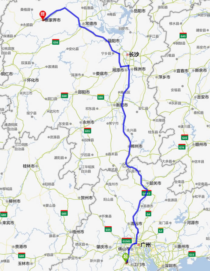 左右,沿途經過鶴山——佛山——廣州市——清遠——英德市——韶關市——樂昌市——宜章縣——郴州市——耒陽市——衡陽市——湘潭市——寧鄉(xiāng)縣——益陽市——常德市——慈利縣——張家界。