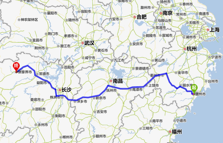 左右,沿途經過溫州——麗水——衢州市——上饒市——鷹潭市——新余市——宜春市——萍鄉(xiāng)市——株洲市——湘潭市——寧鄉(xiāng)縣——益陽市——常德市——慈利縣——張家界。