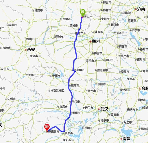 長(zhǎng)治去張家界自駕車自助游線路圖全程高速):