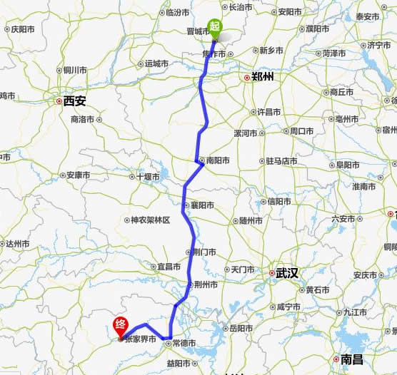 左右,沿途經過晉城——焦作——南陽——襄陽——荊門——荊州——常德(也可以走國道經澧縣、石門縣)——慈利——張家界。