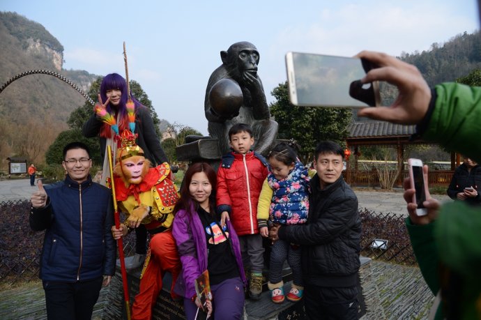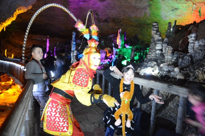手持金箍棒,頭戴紫金冠。2月2日,農(nóng)歷臘月二十四,中國傳統(tǒng)小年節(jié)氣。當(dāng)天下午,旅游勝地張家界武陵源黃龍洞景區(qū),一名“美猴王”打扮的特殊游客現(xiàn)身“后天”雕塑、龍宮大廳、花果山等景點,其惟妙惟肖的“孫悟空”動作表演,不時引來其他游客的驚呼:大圣歸來!